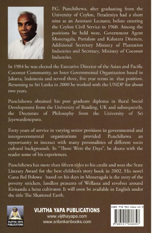 Those Were The Days is an interesting book dealing with the unusual experiences of highly placed public officers, especially the Government Agents and others who have worked in the districts in Sri Lanka and those who sojourned abroad. The author Dr. P.G. Punchihewa has been a Government Agent as well as an international civil servant in Indonesia.